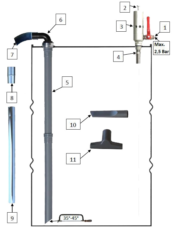 Nimatic Reversible Cleaner NRC-200 driven by compressed Air. Tested and set to a Max. Safety pressure (in drum) of 0,25 Bar, with a running pressure of 2 Bar. This secured by a pilot valve inside the unit. This pilot valve must be checked on regularly basis (ex. every half year). This is very easy to check, by unscrewing the top and push with a finger on pilot to check if it maneuvers free.